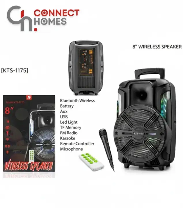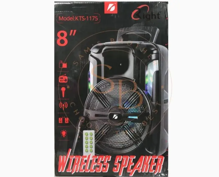 ModelKTS-1175Woofer Size8 Inch (Full Range)Output Power20W - 30W (Peak)Frequency Range45Hz - 18KHzBattery Capacity1500mAh - 2400mAh (High Capacity)Play Time2–3 Hours at Max VolumeSpecial FeaturesFM Radio, TWS, Remote Control, RGB LightMaterialABS Plastic