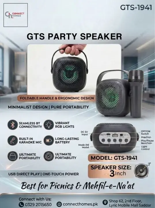 Speaker ka 3-inch driver saaf aur unchi awaz farahum karta hai, jabke iski RGB lights music ke sath mil kar aik behtareen vibe create karti hain. Chahe aap ghar par party kar rahe hon ya camping par ja rahe hon, GTS-1941 apni portable design aur rechargeable battery ki wajah se aapka behtareen sathi hai.