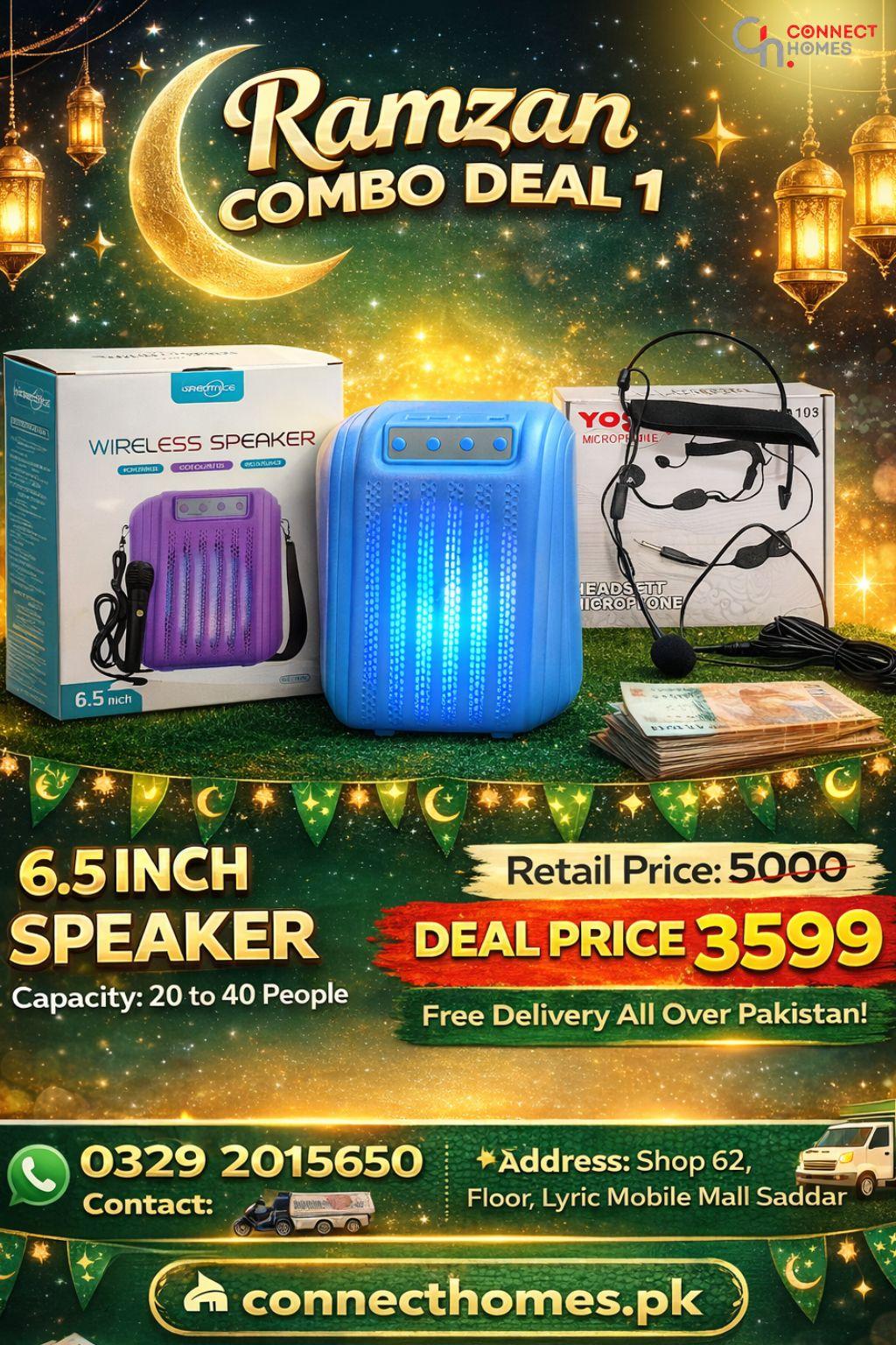 Powerful 6.5 inch wireless Bluetooth speaker with RGB lights and dual microphone support. Perfect for Ramzan mehfil, school events and small gatherings (20–40 people). Long-lasting 1200mAh battery with USB, TF card and FM support.