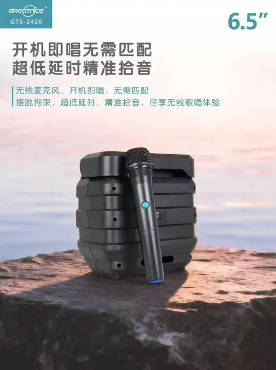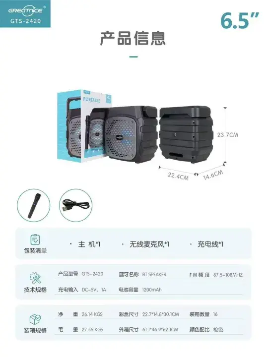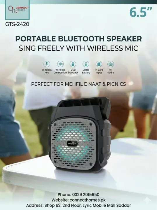 GTS-2420 6.5” Portable Bluetooth Speaker powerful sound ke sath wireless microphone included. FM radio, USB & TF card support aur 1200mAh rechargeable battery ke sath best choice for indoor & outdoor use.