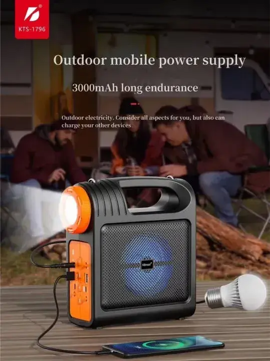 KTS-1796 sirf aik speaker nahi, balkay outdoor adventures aur ghar mein emergency light ke liye aik mukammal solution hai. Chahe light chali jaye ya aap camping par hon, ye device aap ko music aur roshni dono faraham karta hai. Iska 3000mAh power supply feature aapka mobile charge rakhne mein madad deta hai.