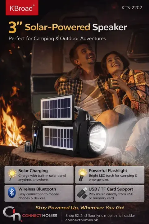 KTS-2202 Portable Bluetooth Speaker with Dual Solar Panels – 3 Inch High-Bass Driver – Built-in Torch Light – Special Discount Offer
