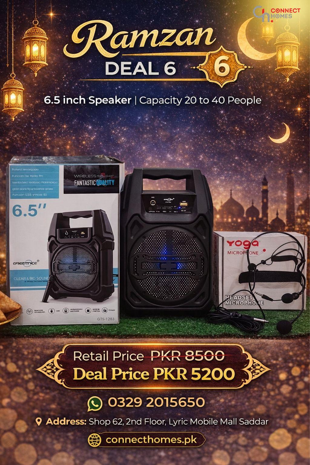 Take your religious gatherings to the next level with Ramzan Deal #6. This professional bundle features the high-performance GreatNice GTS-1283 6.5-inch speaker paired with the industry-standard Yoga DM-193 Headset Mic. Designed for larger rooms and outdoor settings, this combo provides "Fantastic Quality" sound with deep bass and clear trebles, ensuring your recitation or speech is heard with perfect clarity.