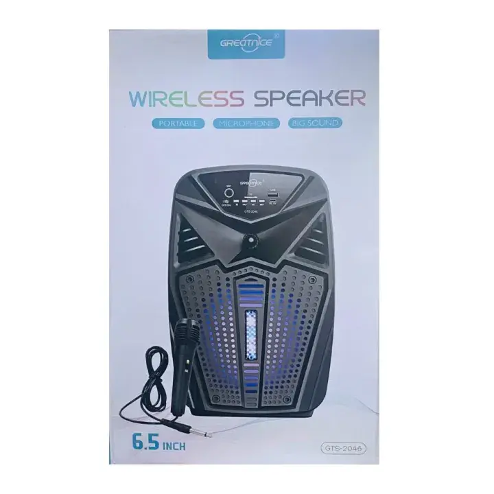The package includes a wired microphone, allowing you to turn any moment into a karaoke party. With its 1600 mAh battery, you can enjoy your favorite tracks for up to 5 hours on a single charge. Lightweight yet durable, the GTS-2046 is the perfect high-quality audio solution for those who want "Big Sound" in a portable package.