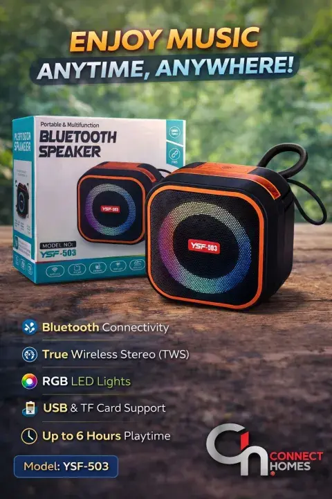 The YSF-503 Wireless Speaker is your ultimate outdoor music companion. Don't let its small size fool you—this speaker is designed to deliver "High Quality Small Sound" with an emphasis on Heavy Bass. Its rugged and waterproof exterior makes it safe to use near water or during hiking.
