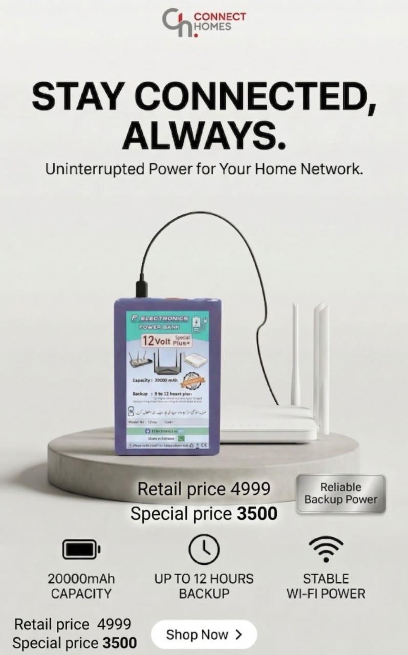 Never lose your internet connection again with the Special Plus 12V WiFi Router UPS. Specifically designed for the unstable power conditions in Pakistan, this 20000mAh power bank acts as a seamless bridge for your internet. It supports high-end Fiber-to-the-Home (FTTH) routers which require stable 12V power to maintain high speeds.