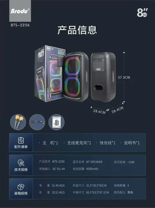 Enjoy ultimate karaoke and party experience with BTS‑2256 8″ Bluetooth Speaker. Features 2 wireless microphones, karaoke/KTV mode, and dual 8‑inch speakers for powerful stereo sound. Ideal for home entertainment, parties, and events. Long-lasting 4500 mAh battery with DC 5 V 4 A fast charging.
