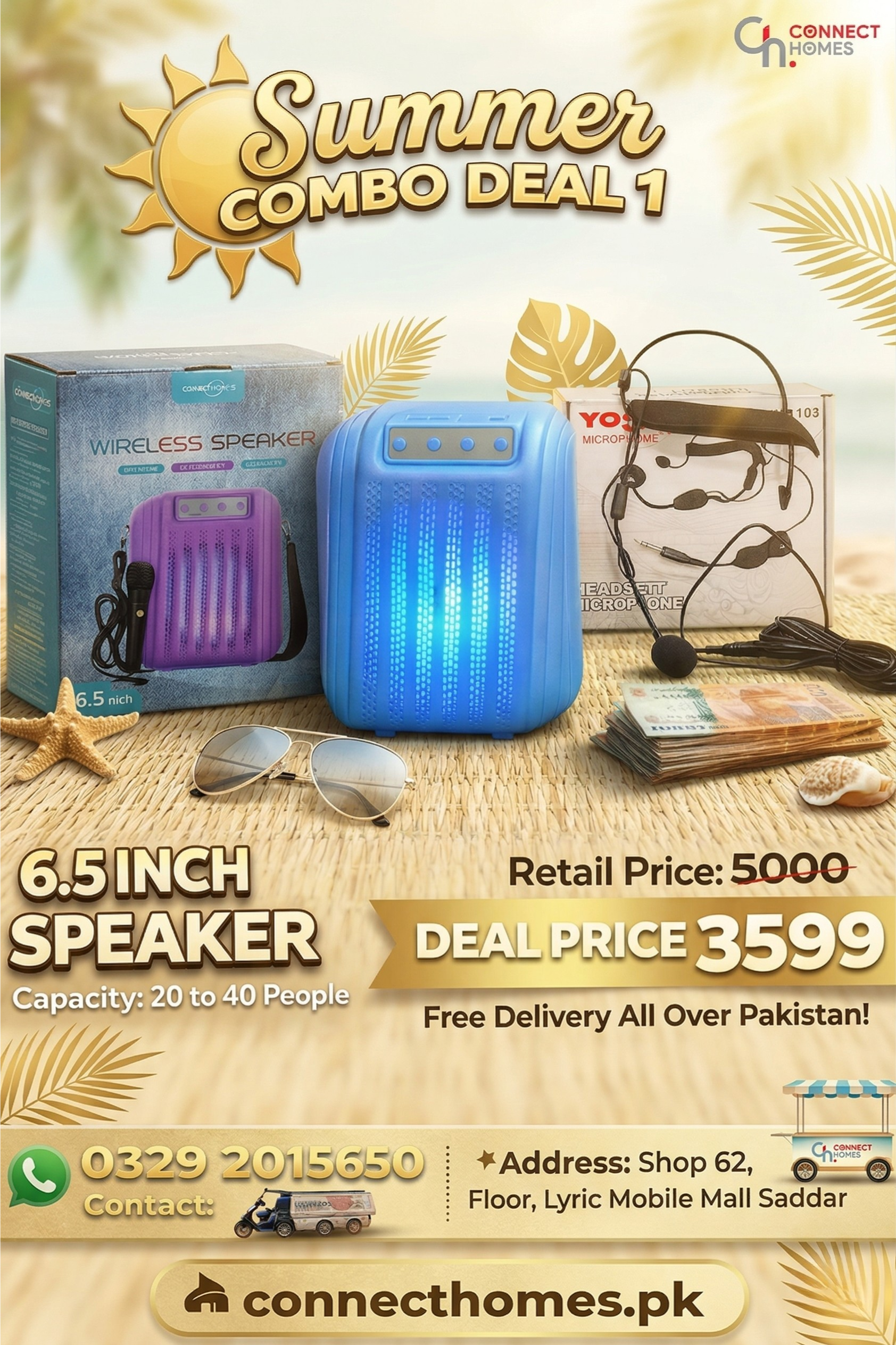 Powerful 6.5 inch wireless Bluetooth speaker with RGB lights and dual microphone support. Perfect for Ramzan mehfil, school events and small gatherings (20–40 people). Long-lasting 1200mAh battery with USB, TF card and FM support.