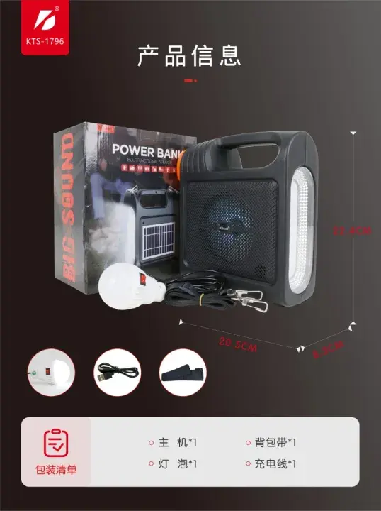 KTS-1796 Portable Outdoor Power Supply & Wireless Speaker - 3000mAh Battery - Solar Charging Supported - FM Radio, Bluetooth, USB & TF Card - Built-in Emergency Torch & External LED Bulb - Multi-functional Camping Sound System