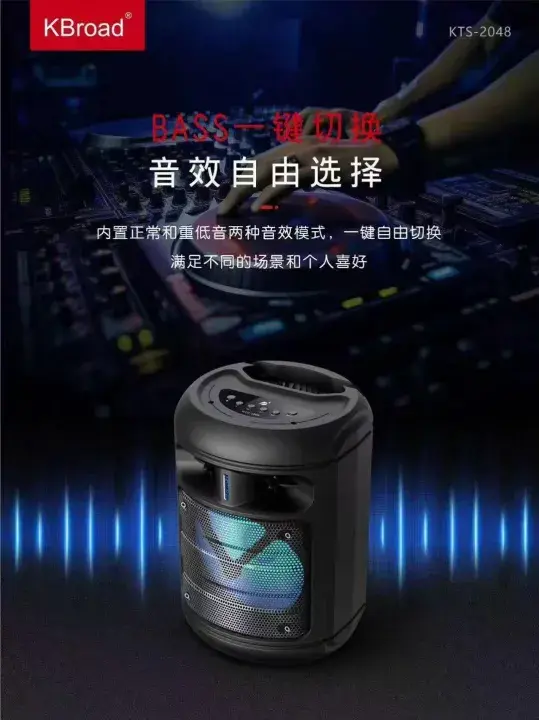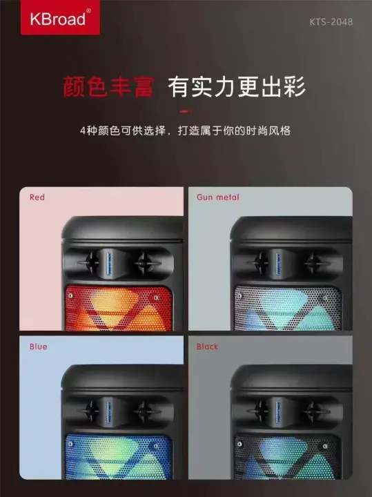 The RGB LED light effect creates a colorful party atmosphere while music is playing. Powered by a 2400mAh rechargeable battery, the KTS-2048 speaker provides long playback time and is easy to carry with its portable handle design.